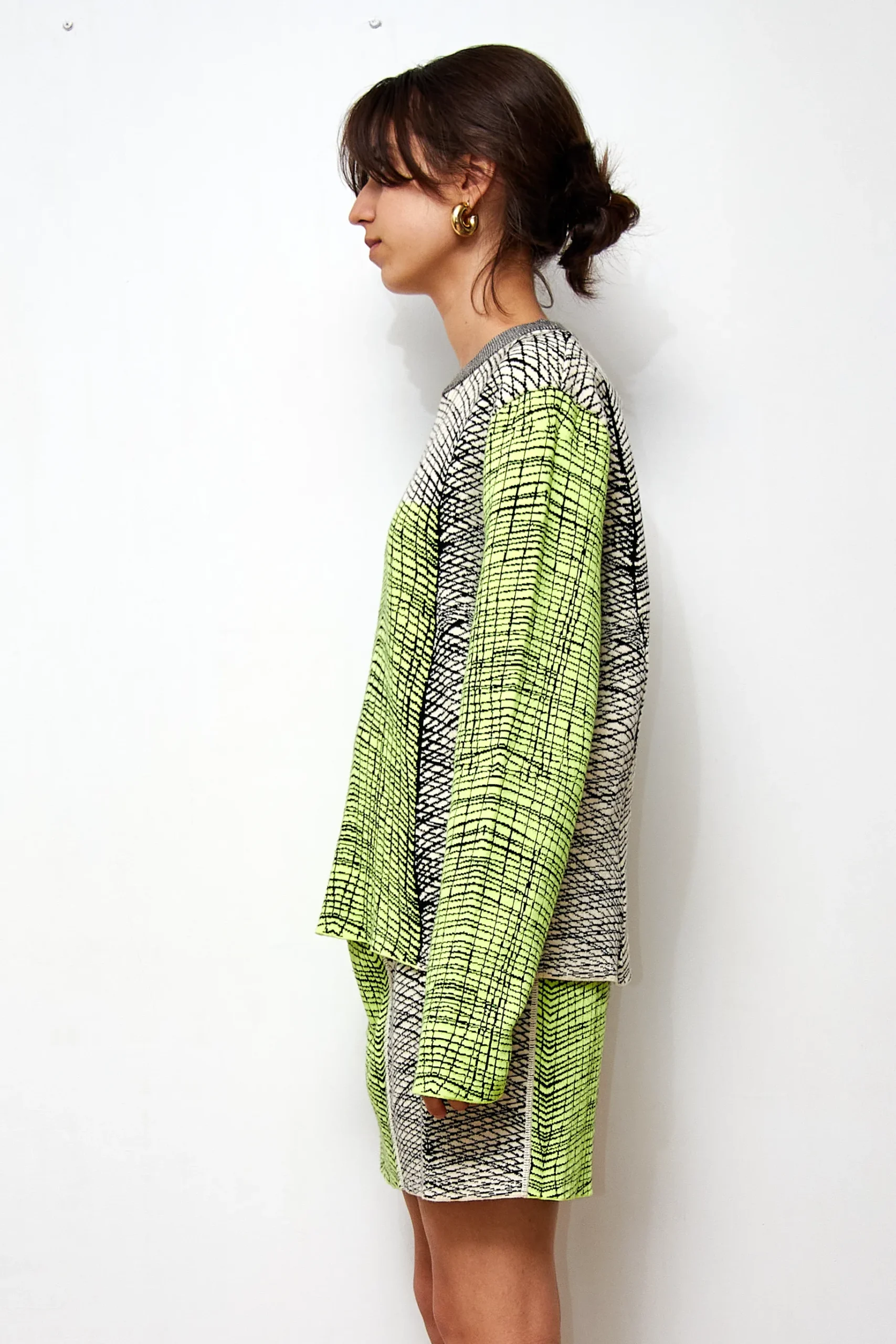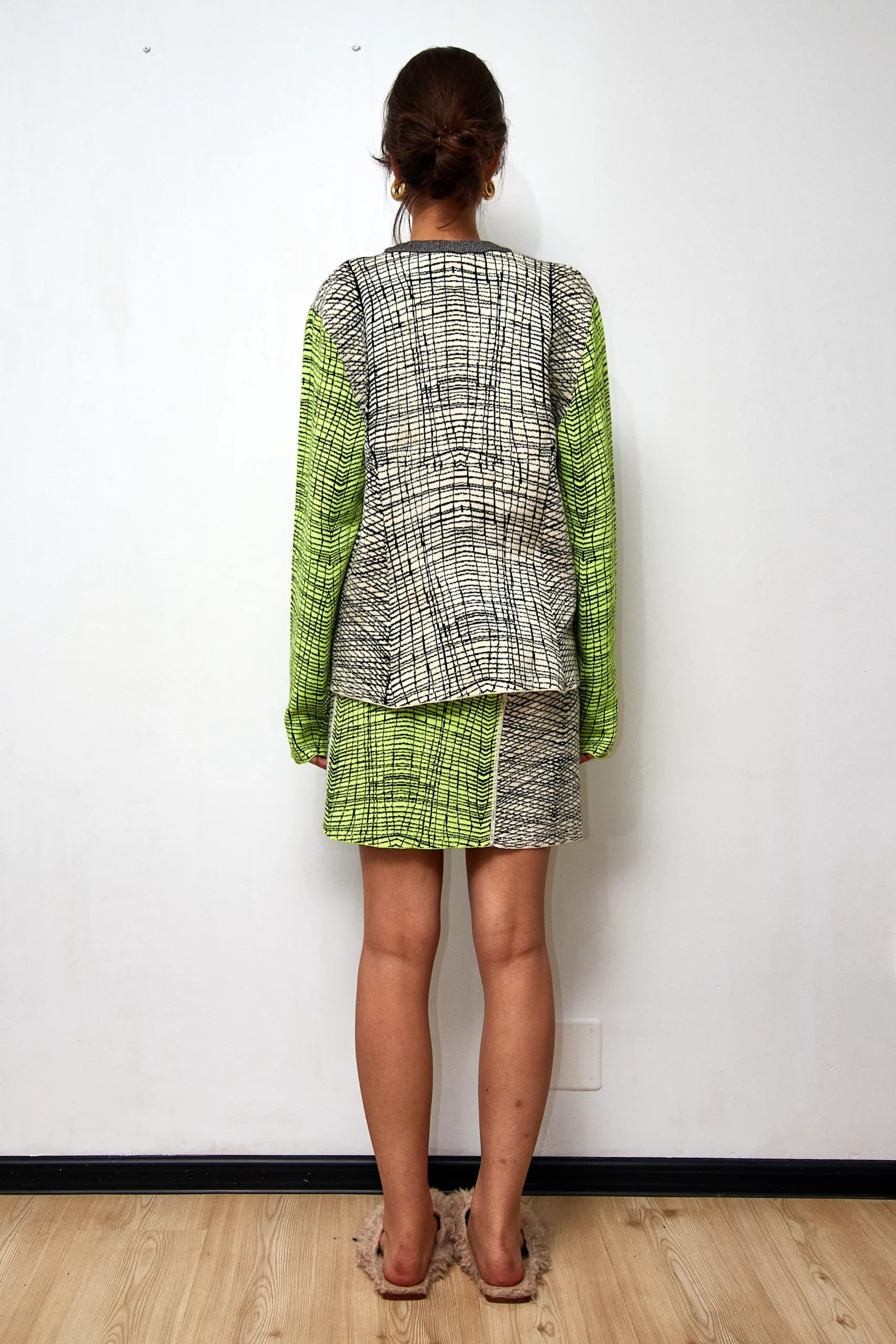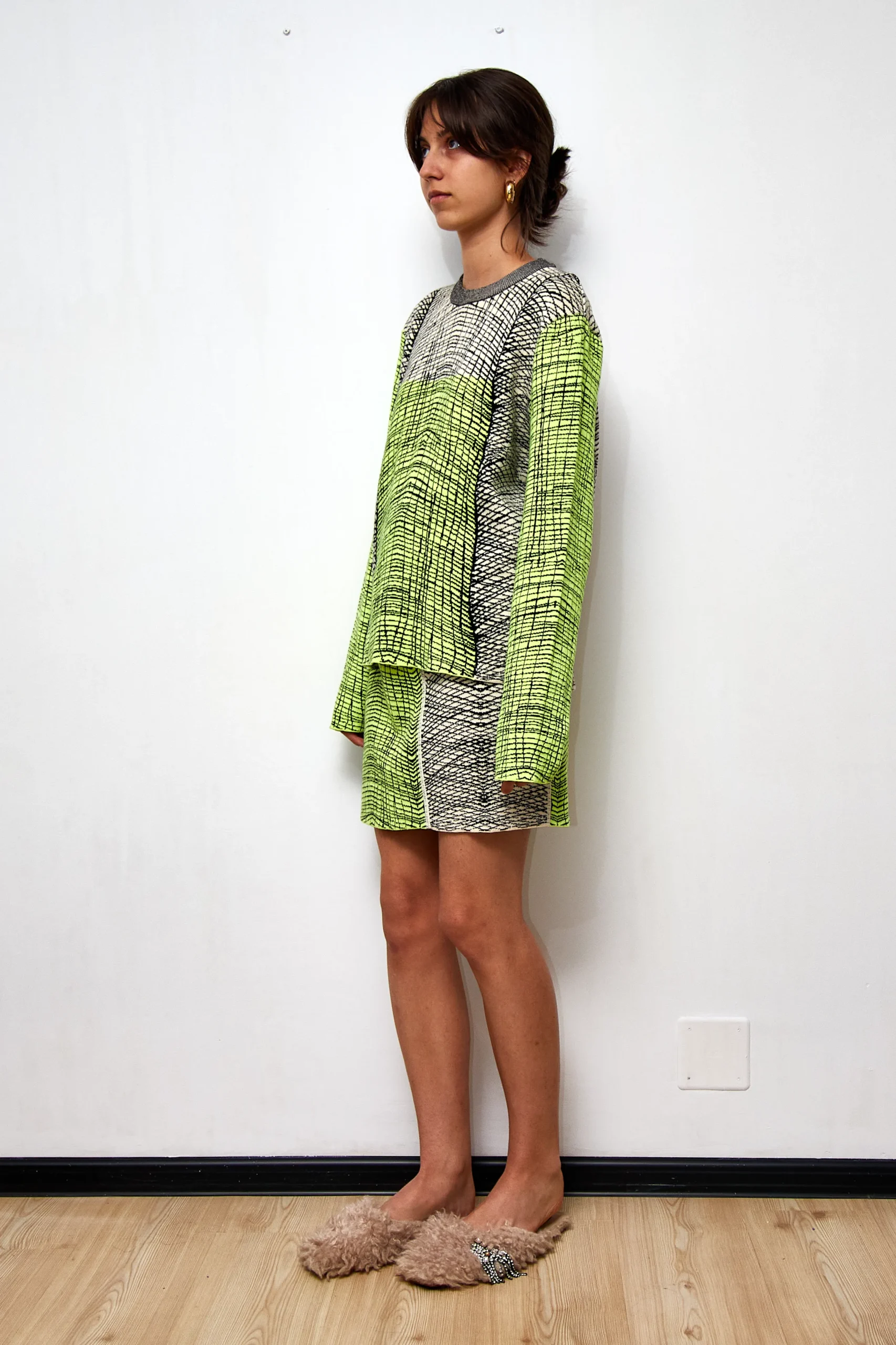 Knitted Kenzo set with sweater and skirt with elasticated waist. Sweater length: 62cm, bust 100cm. Skirt: length 51cm, waist up to 90cm. 65% cotton, 23% viscose, 15% polyester.