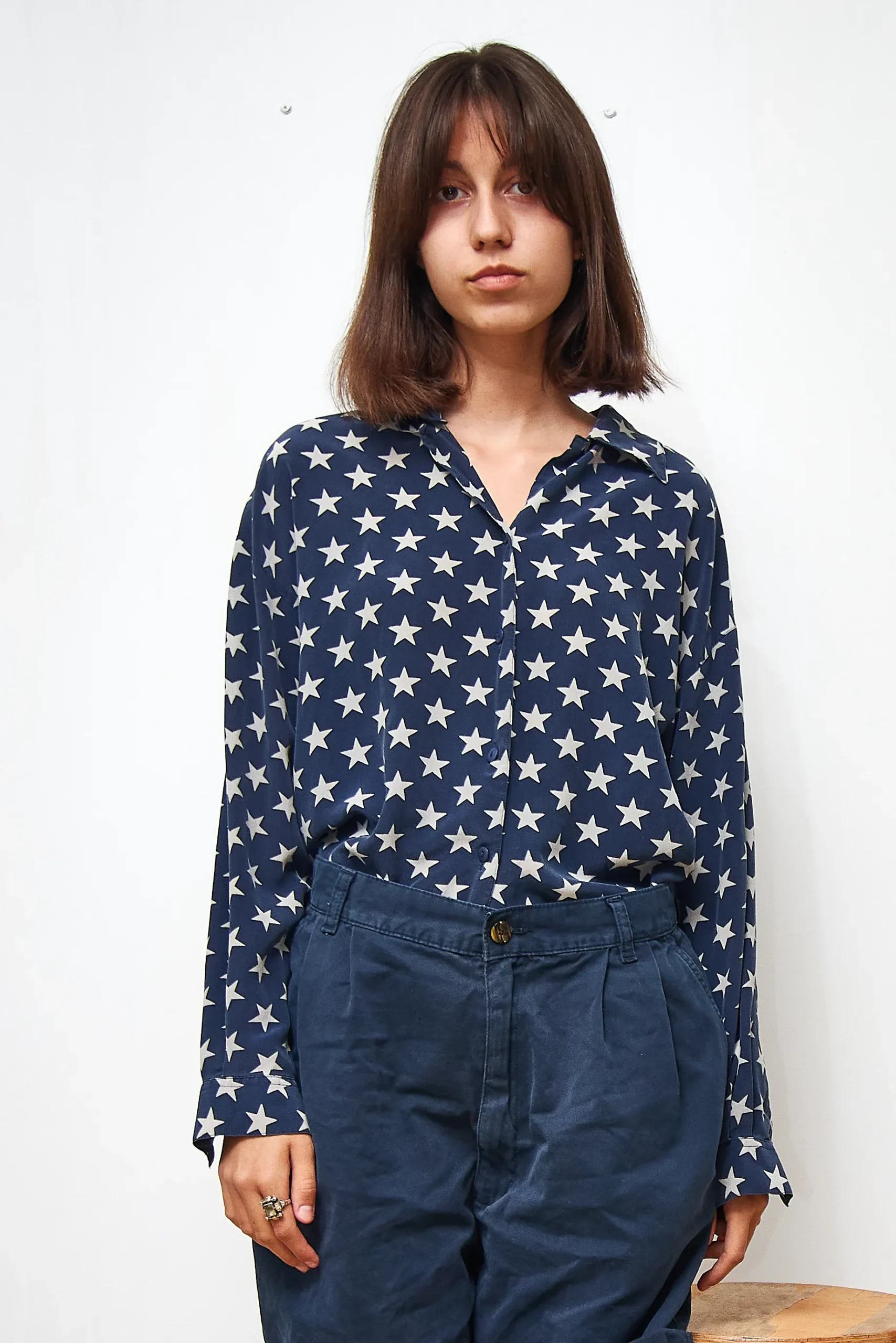 Silk Vintage Shirt in navy with offwhite stars print. Length 75cm, Bust 120cm.