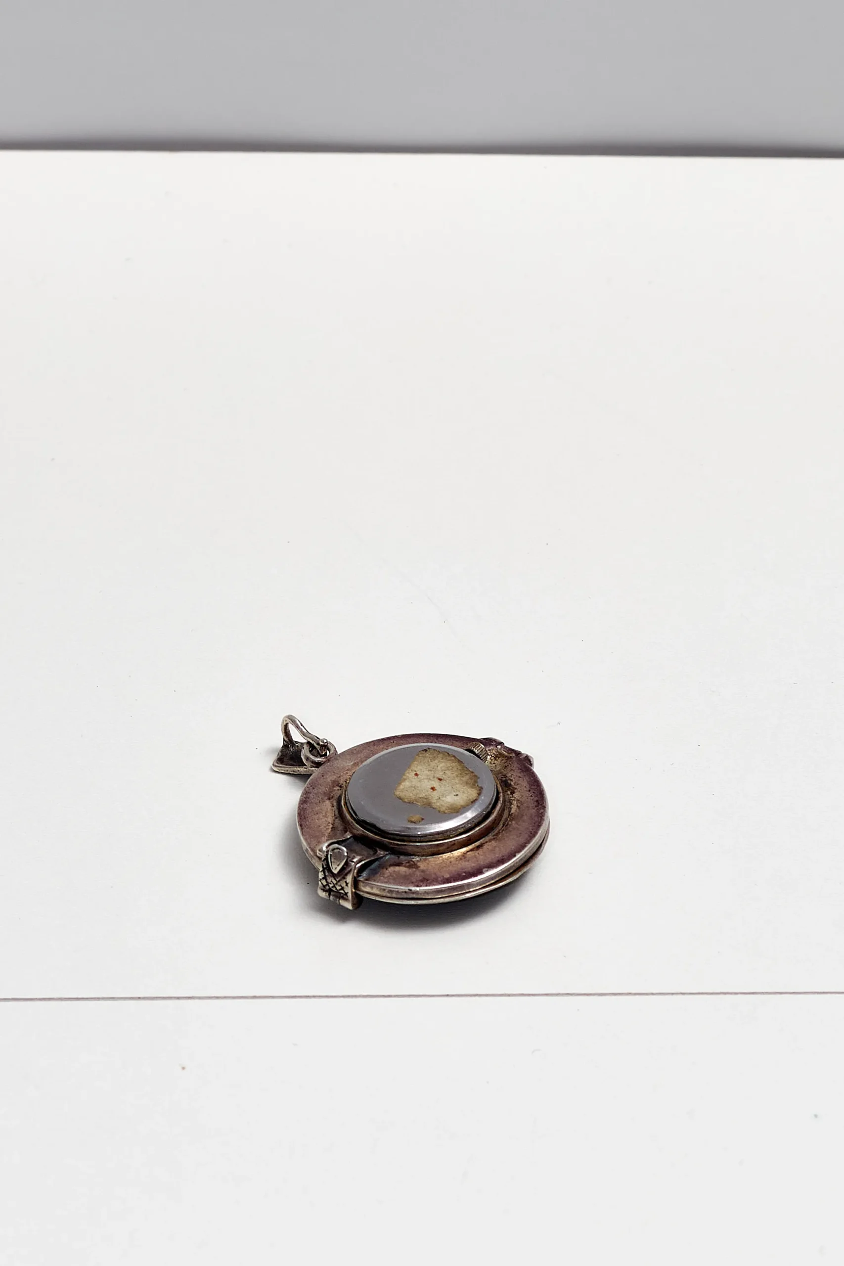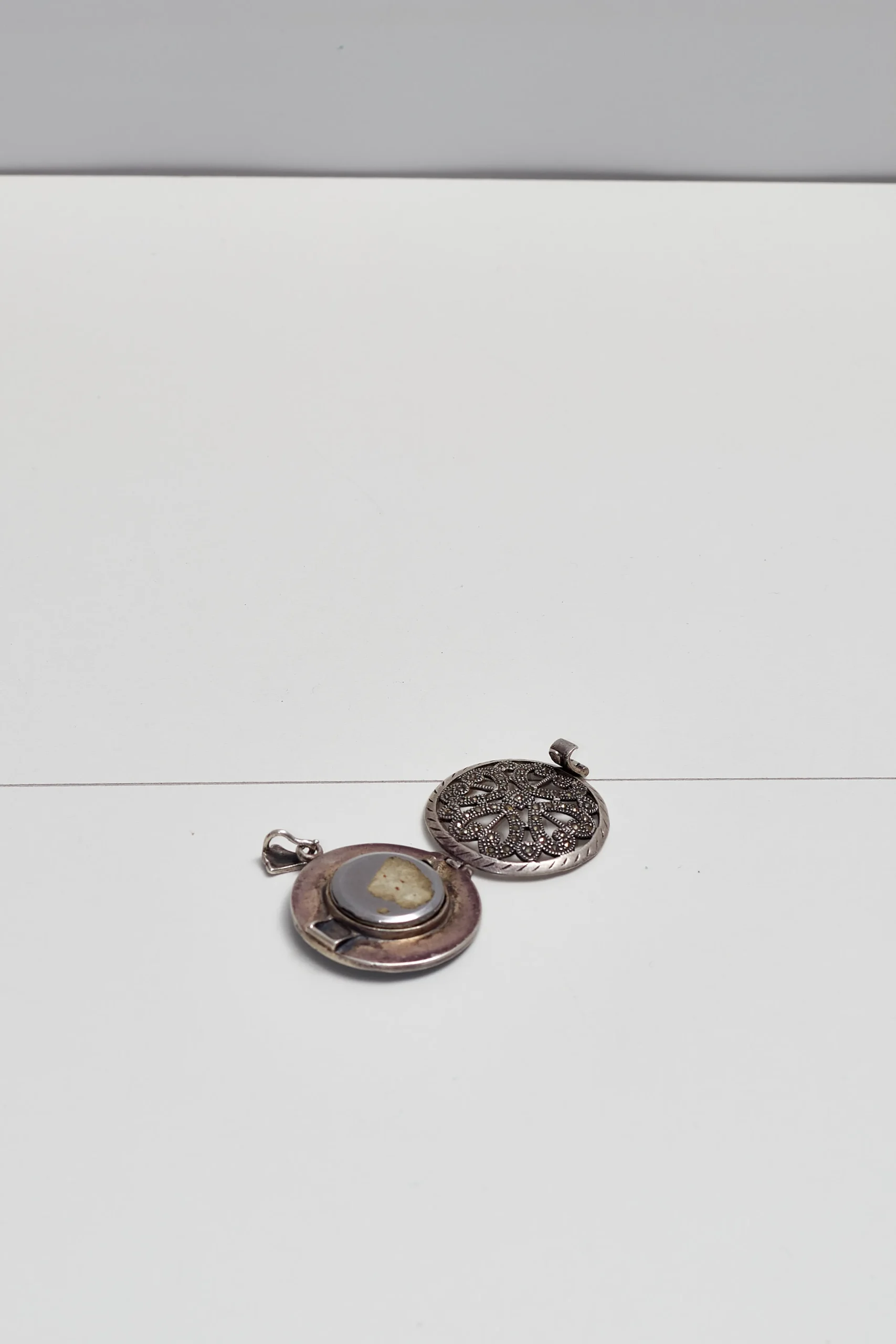 Vintage pendant watch art deco, with a sterling silver case, with filigree, crafted into a geometric, starburst-like pattern, with glittering marcasite stones. Not functional.