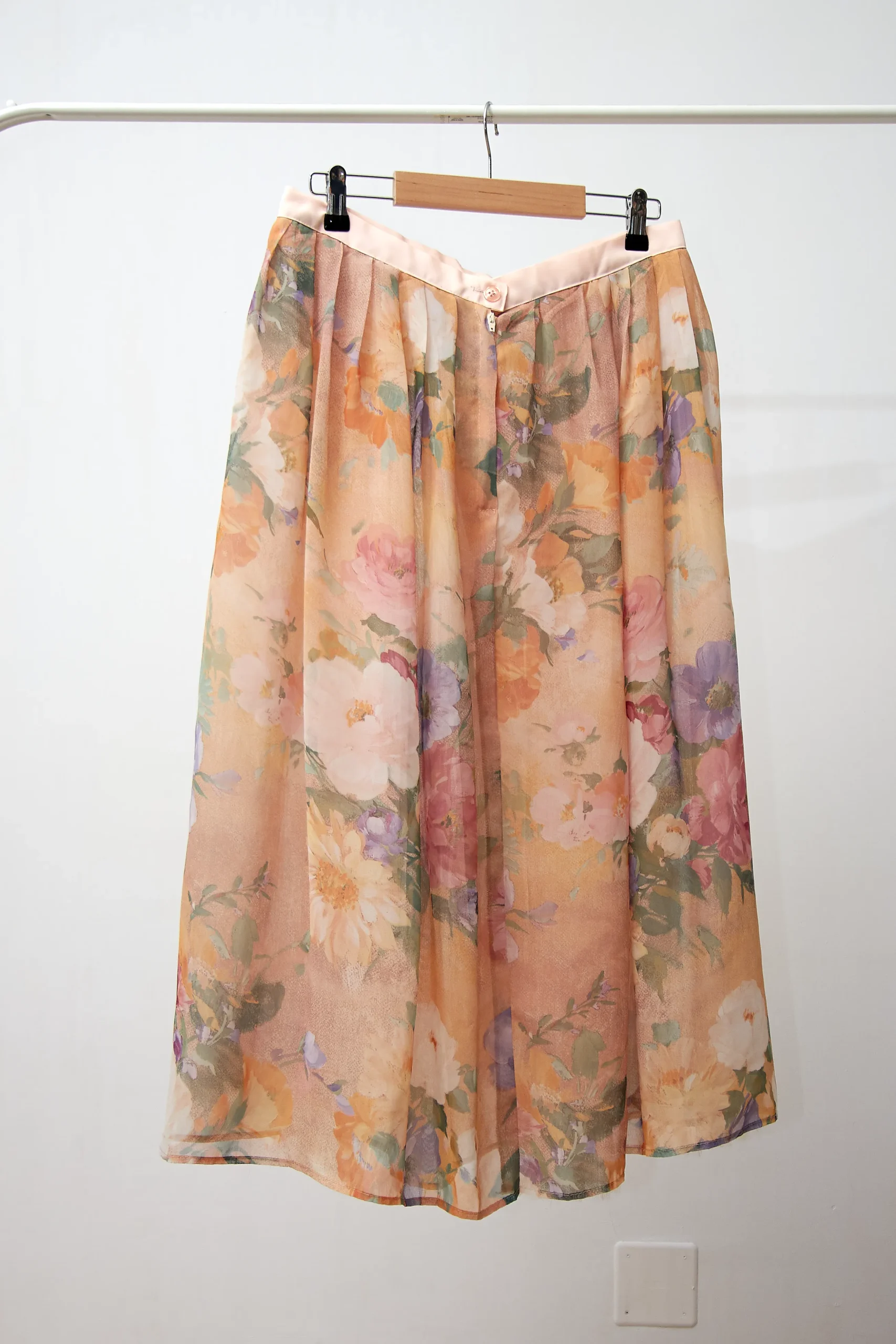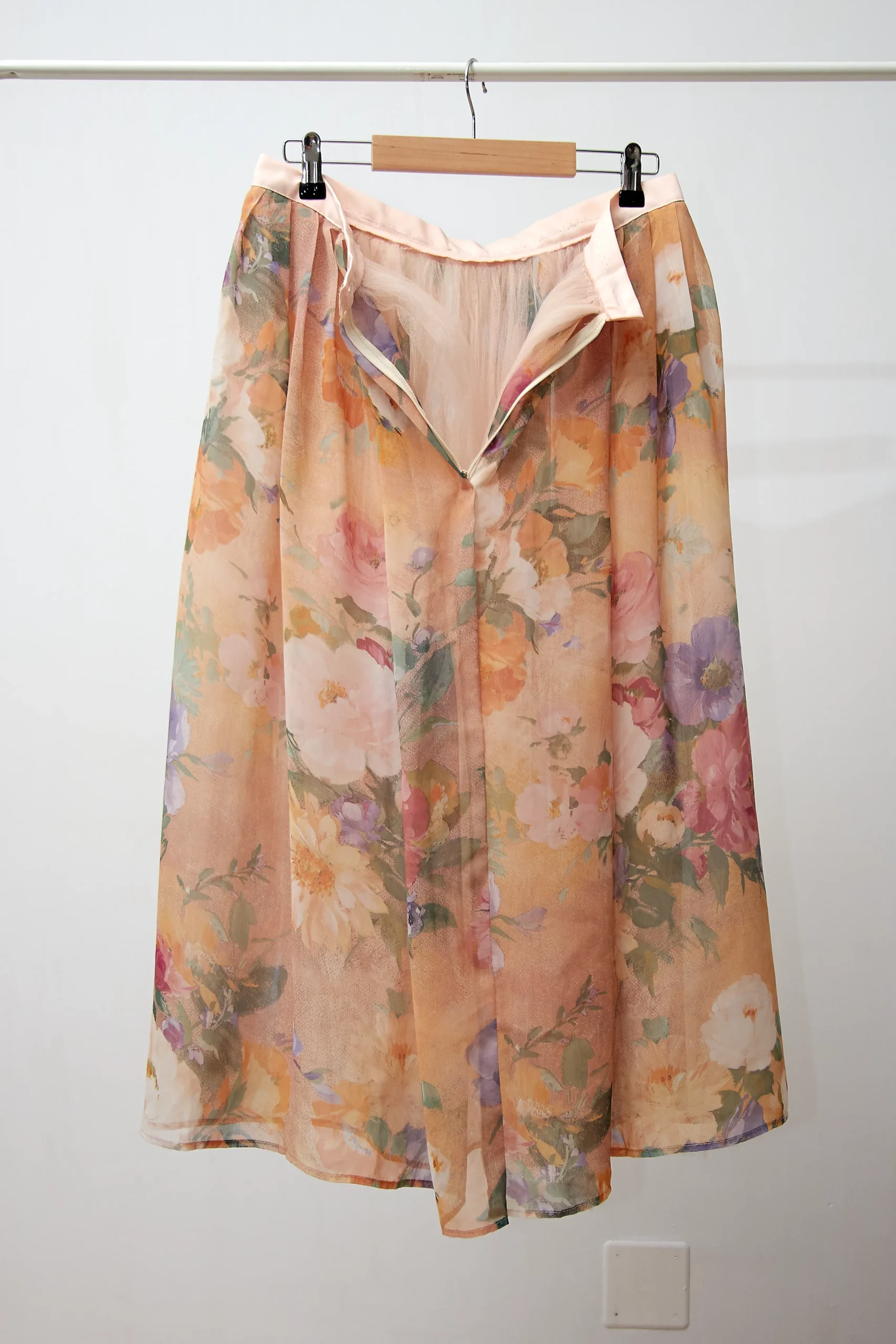 Vintage skirt with a floral print and a tulle lining. Missing composition label. Waist 82cm, length 83cm.