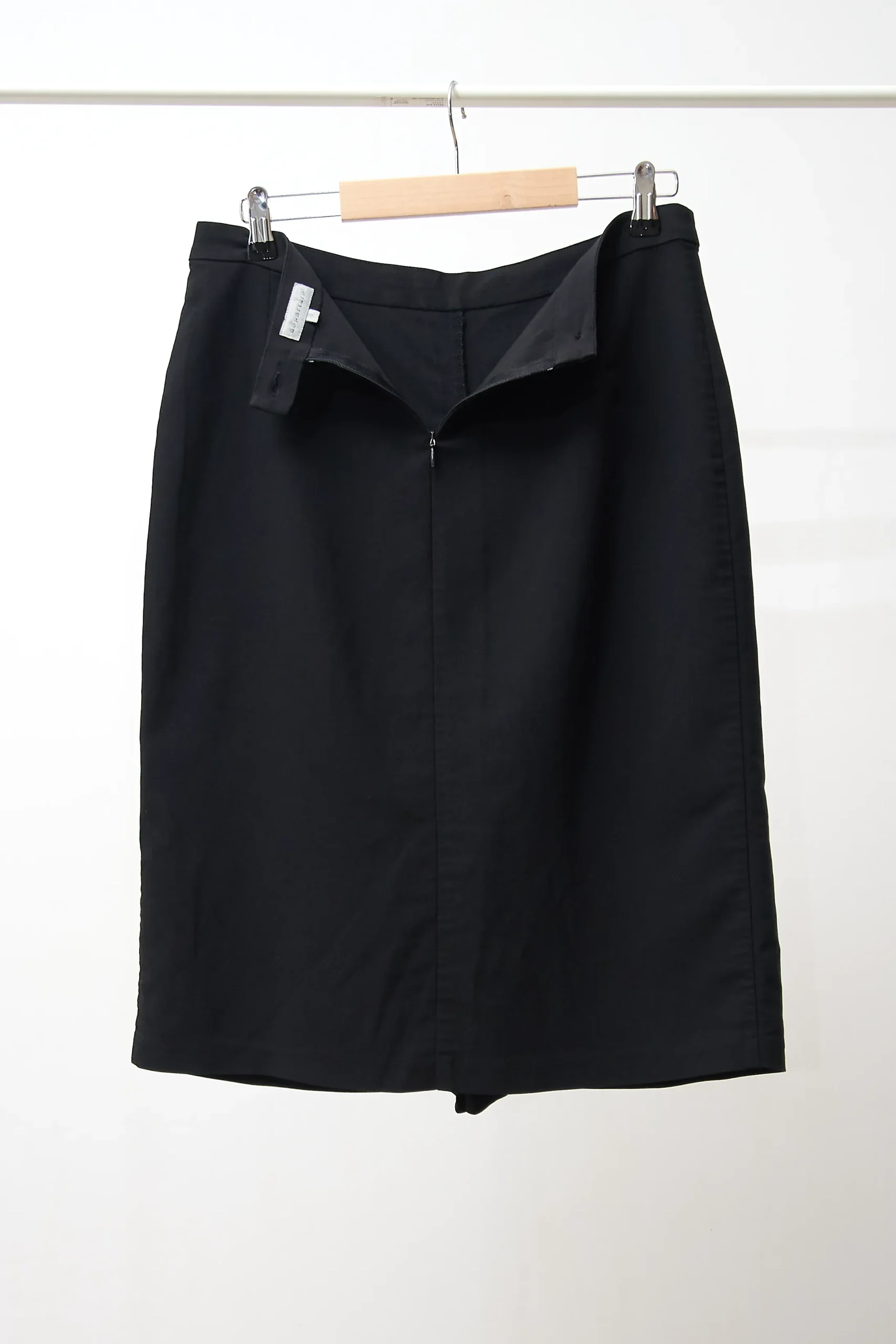 Vintage black skirt, no inside tags, most likely cotton and elastane blend, with a zip closure at the back. Waist: 44cm max, length 64cm.