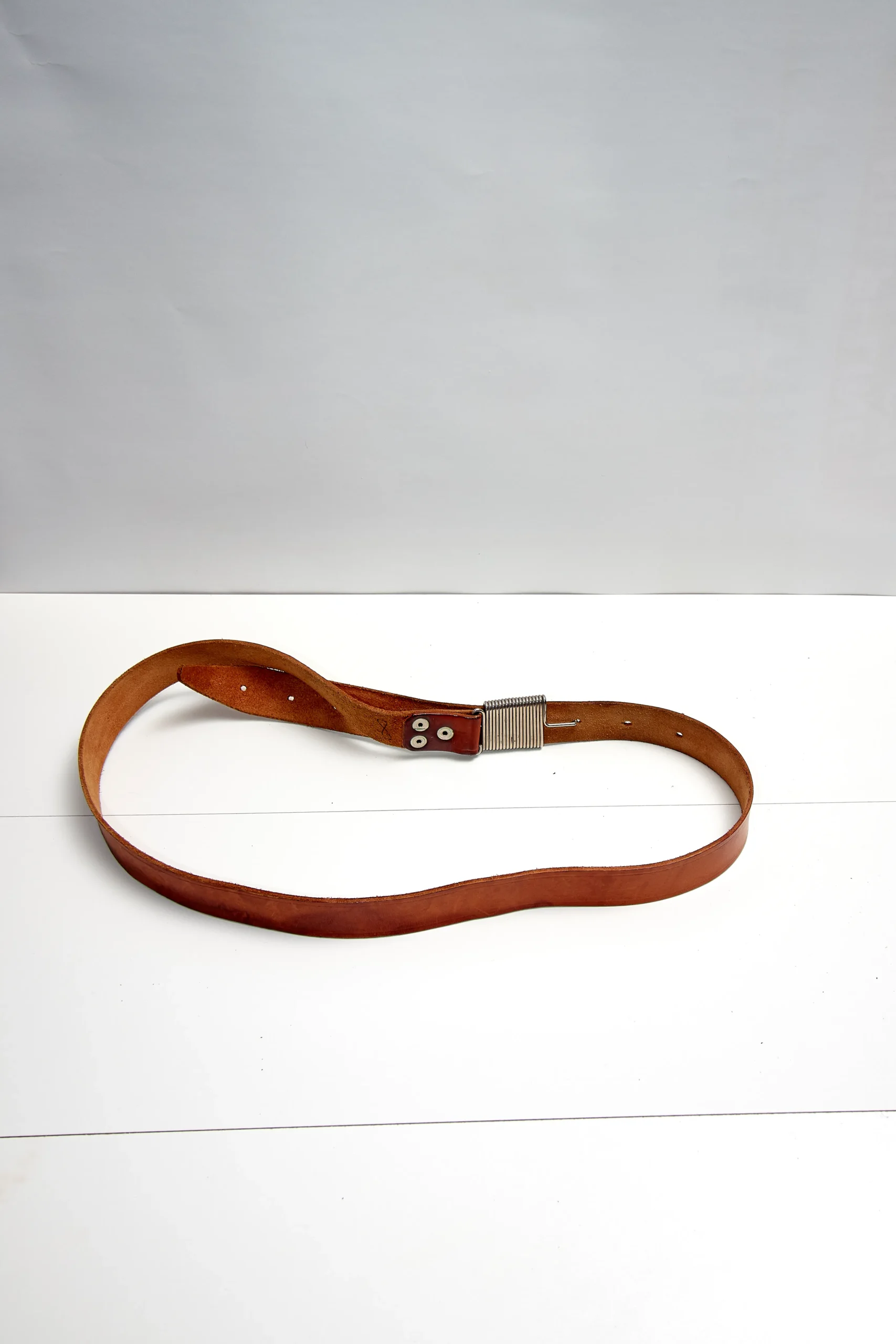 Vintage leather belt with a silver coil-style buckle constructed from metal wire. 120cm length, 2,5cm wide.