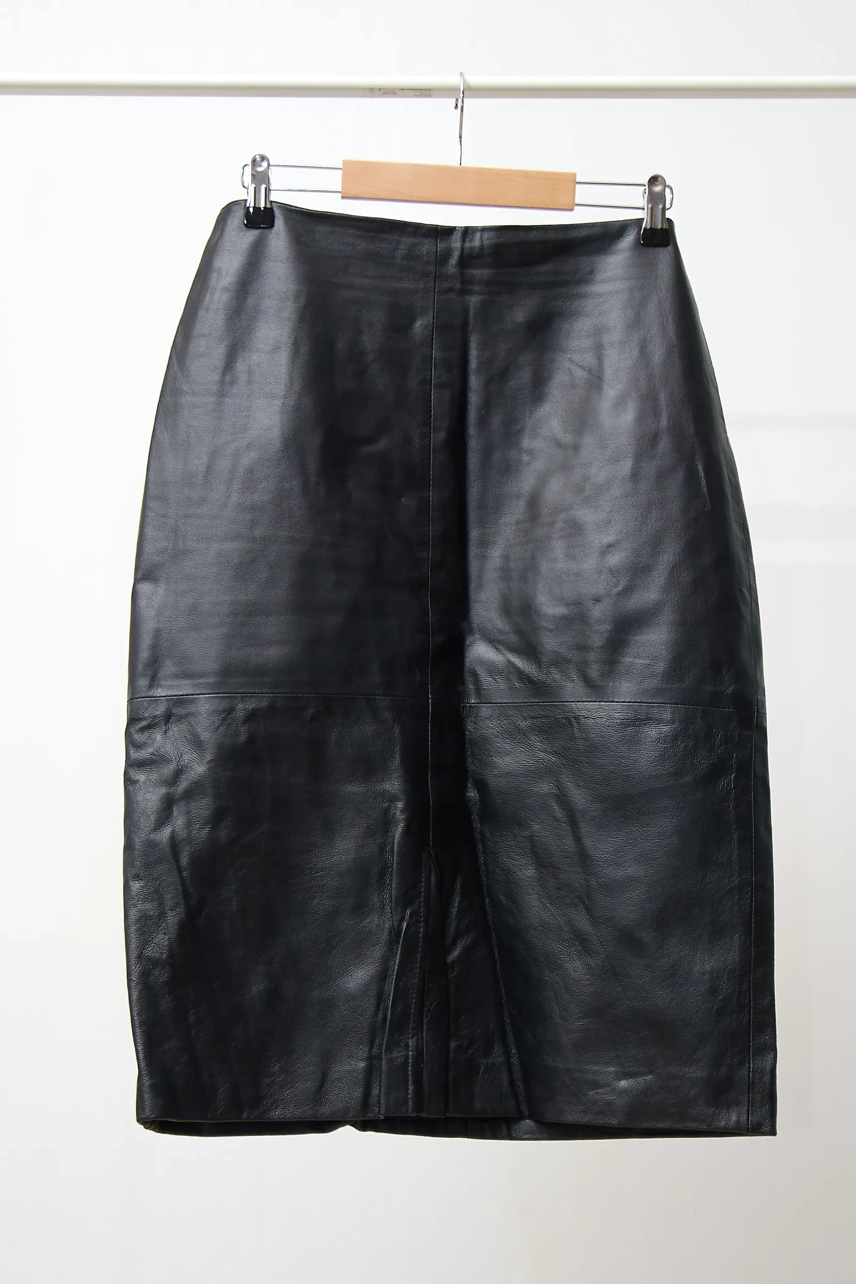 Vintage leather skirt with a back zipper. 100% leather, fully lined in 100%m polyester. Length 68cm, Waist 78cm.