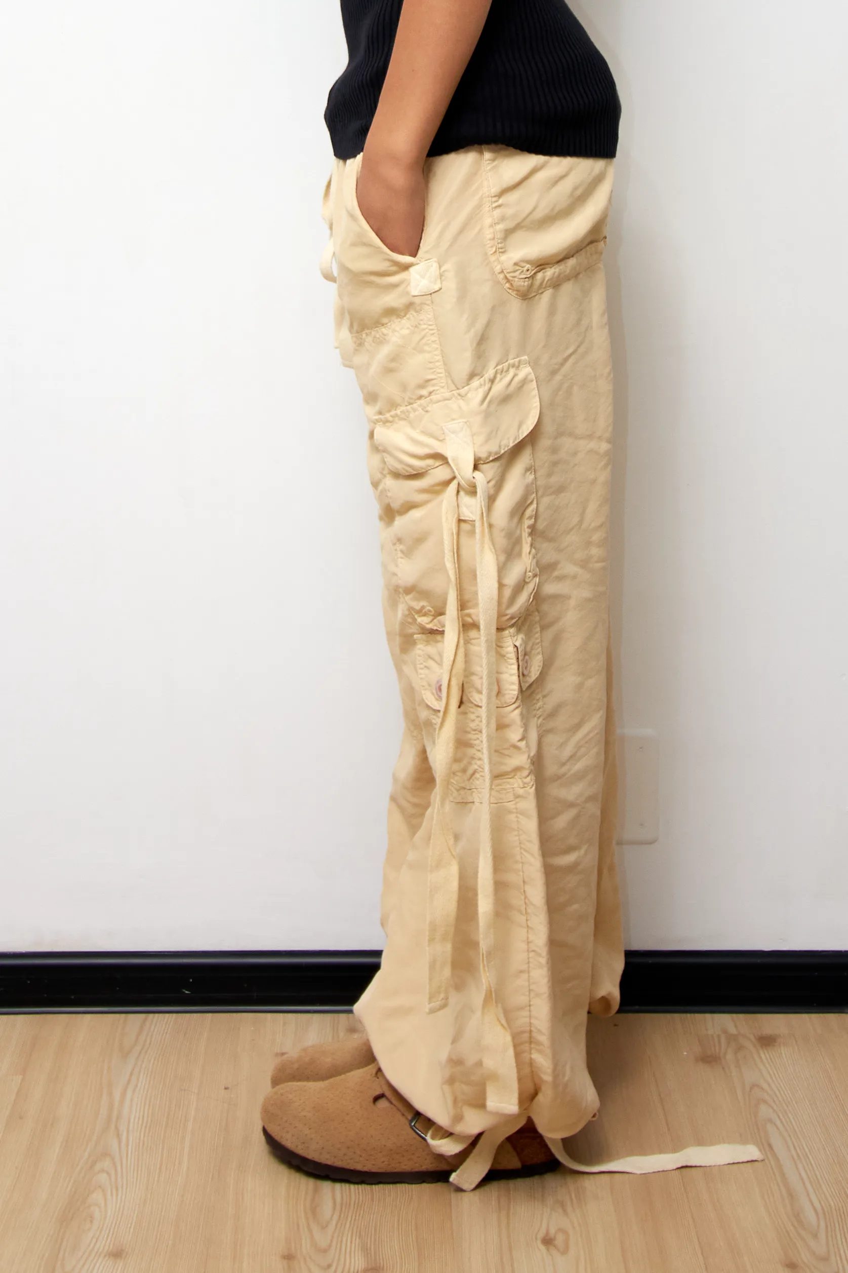 Silk cargo trousers in beige, with pockets and adjustable waist. Length 105 cm, waist max 93cm. 100% silk.