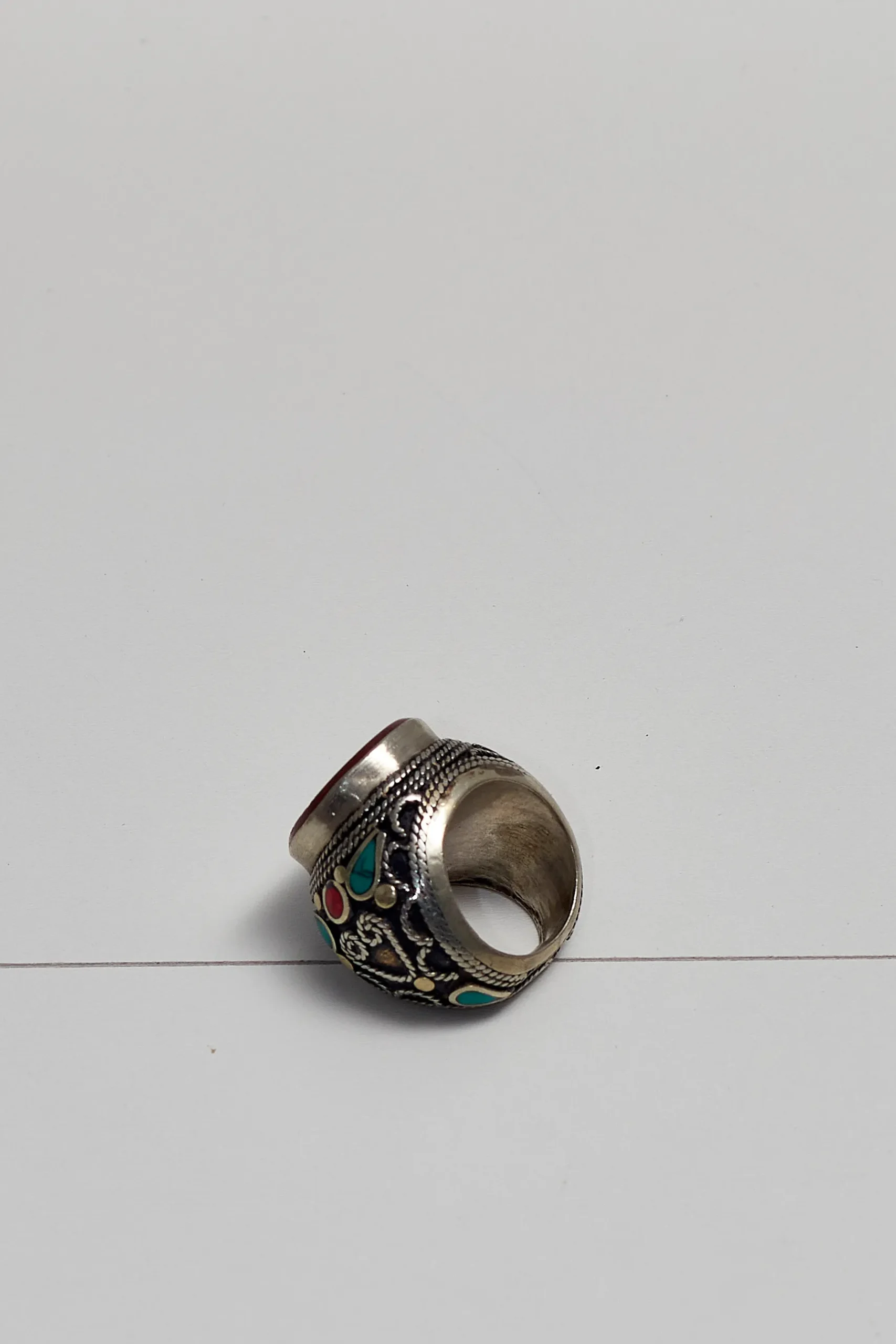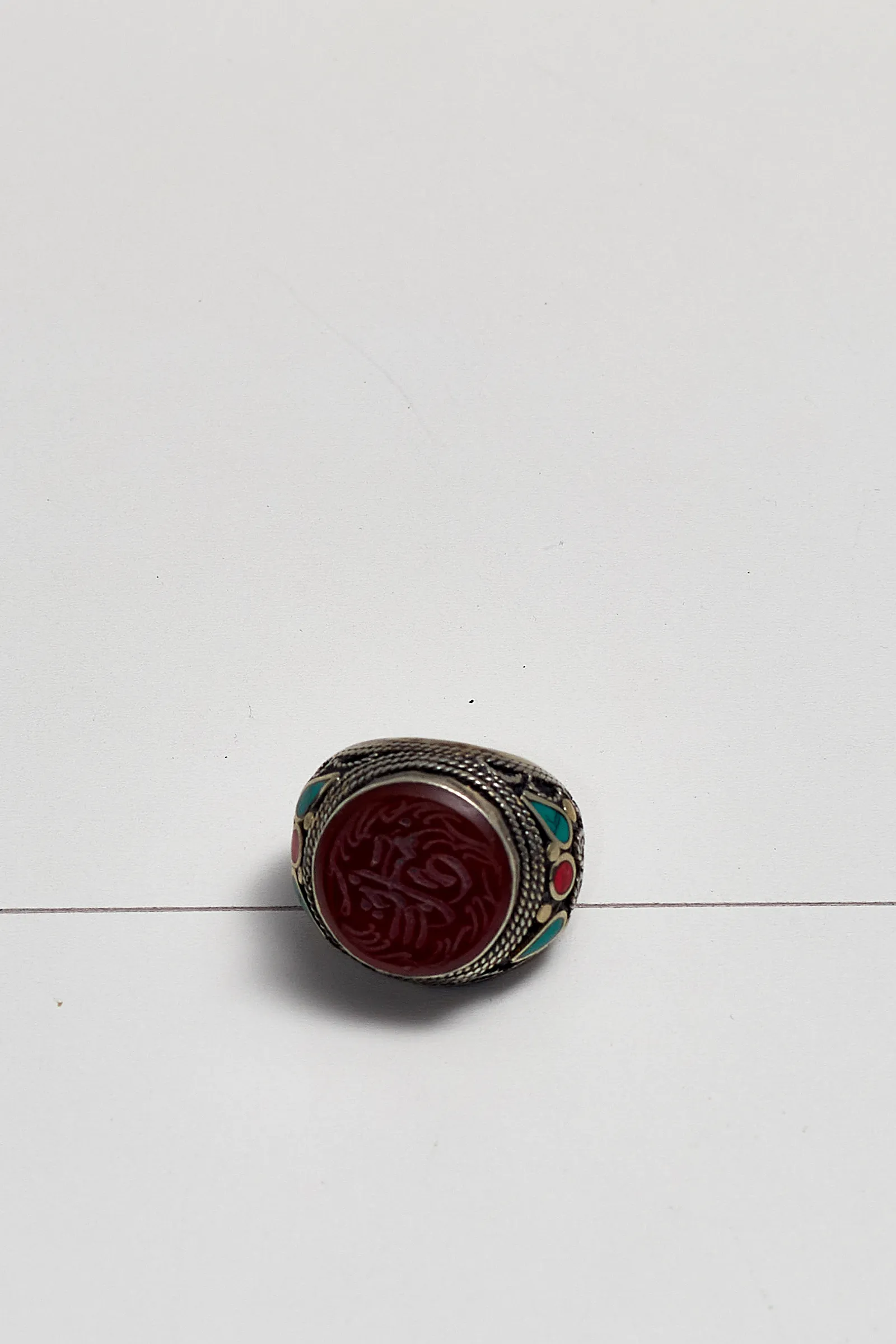 Vintage ethnic or tribal signet ring, handcrafted with a wide band, with a carnelian stone hand-carved in an intaglio style, coral and turquoise for the decorative inlay.